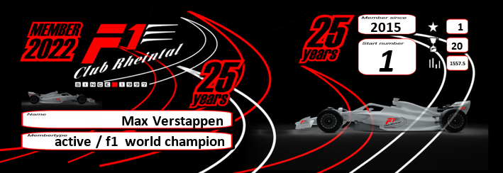 Auf der Membercard ist dein Name vermerkt und was du für einen Mitgliedstatus hast – bist du Goldmember, Ehrenmitglied, Vorstandsmitglied oder Supporter? Jede Karte zeigt, seit wann du Vereinsmitglied bist – wie z.B. der Max, der seit 2015 in der F1 fährt. Jedes Mitglied hat seine eigene individuelle Startnummer, welche beim Vereinseintritt ausgewählt werden darf. Und dann gibt es noch 3 interessante Zahlen aus der Kart-GP Hall of Fame des F1-Club Rheintal: